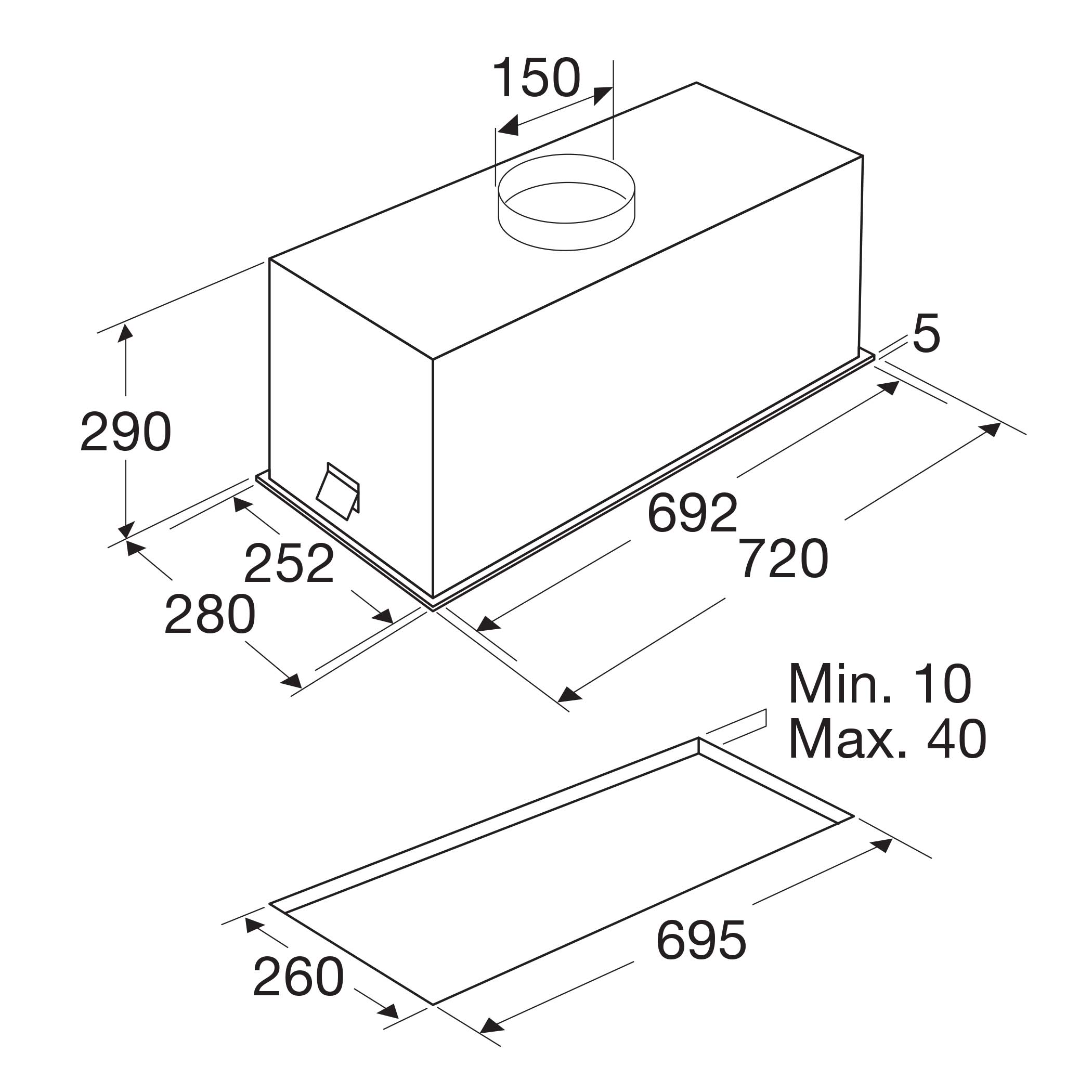 hauteur de suspension de minimum 65 cm au-dessus d'une taque de cuisson au gaz, et de minimum 50 cm au-dessus des taques de cuisson à induction et vitrocéramiques