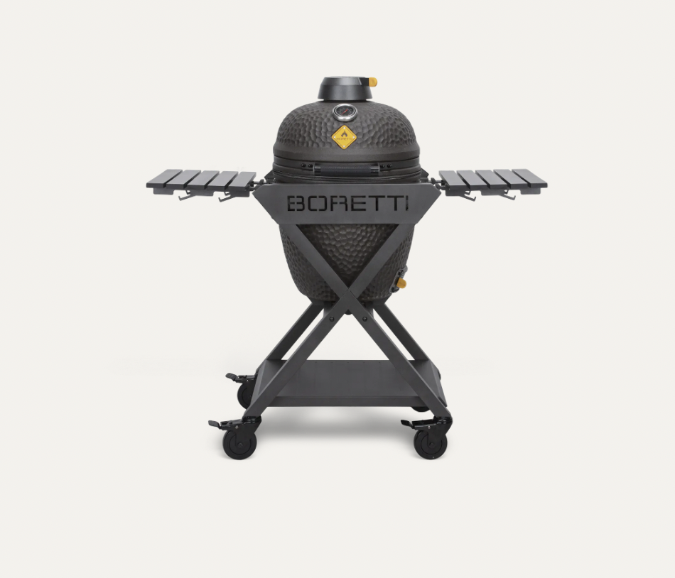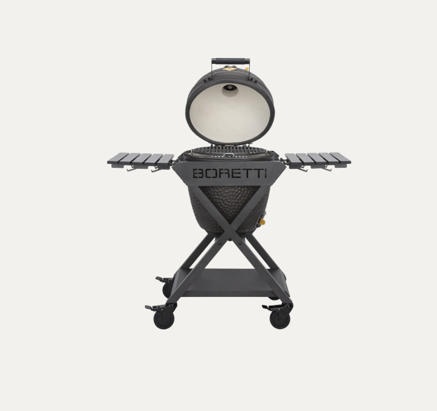 Le cadre BORETTI X unique et la finition personnalisée du boîtier en céramique font du BORETTI Ceramica Medium le point central de votre jardin. L'évent supérieur unique de Boretti se déplace verticalement et est protégé par un toit. Ce mécanisme empêche la pluie de s'infiltrer dans votre kamado et en fait un barbecue résistant aux intempéries