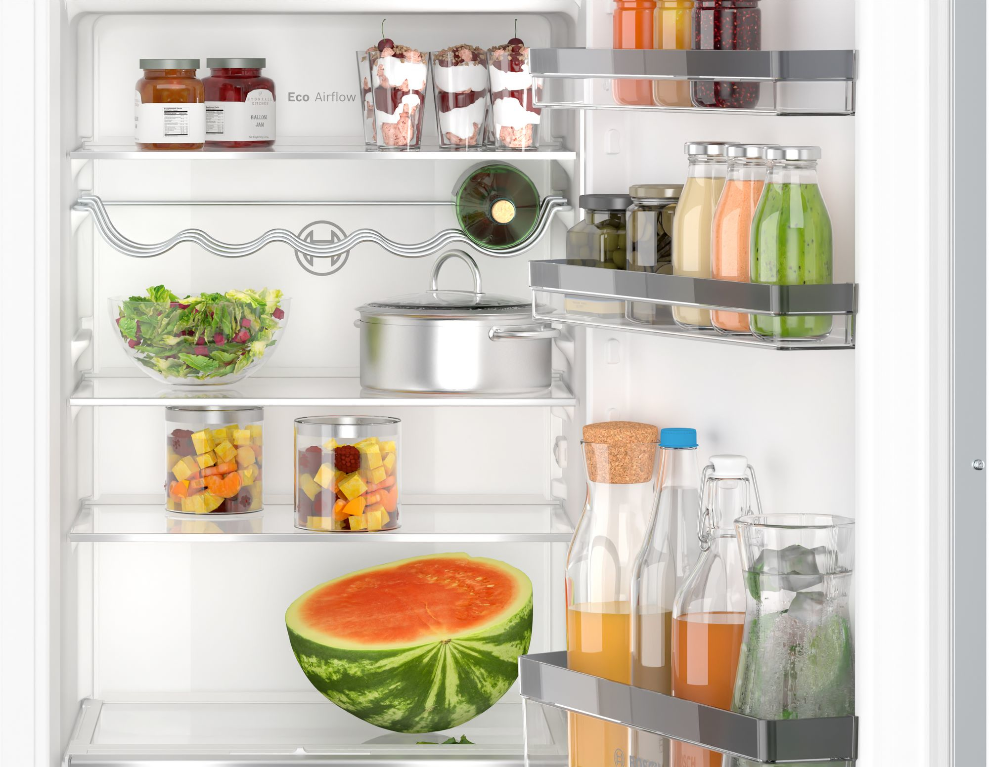 Le réfrigérateur encastrable spacieux avec le tiroir VitaFresh XXL pour les fruits et légumes, le compartiment congélateur et les clayettes particulièrement stables permettent un stockage optimal des aliments.