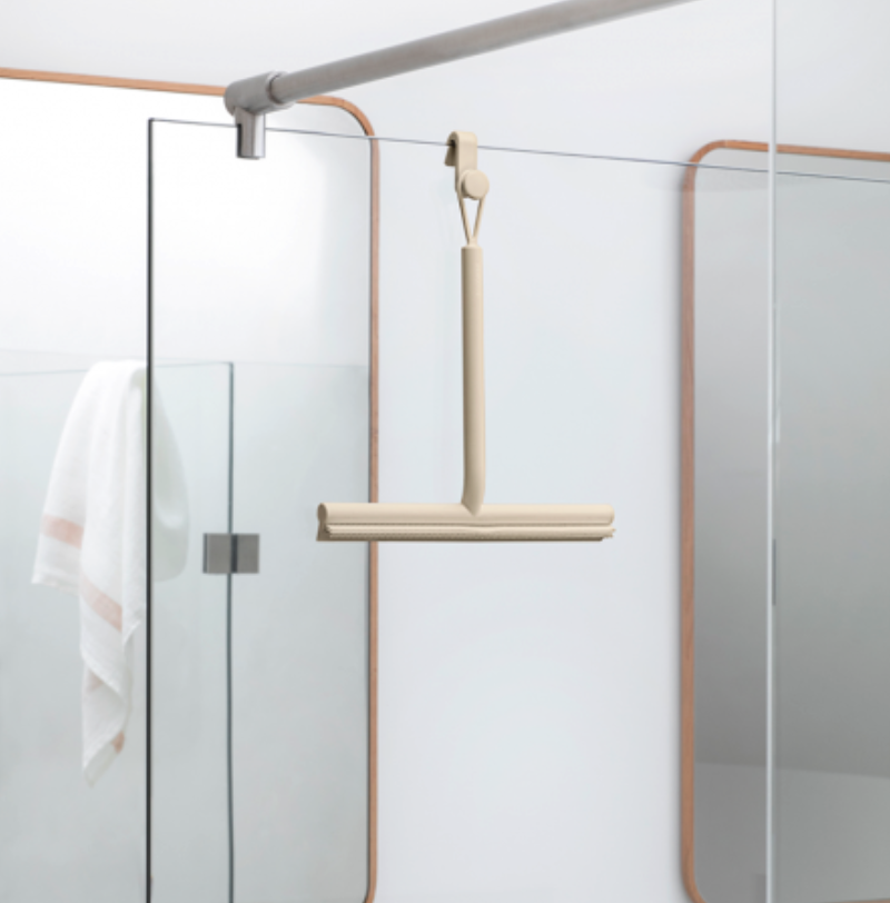 Multi-talent - un côté pour nettoyer les résidus de savon (brosse), un côté pour sécher (racloir).