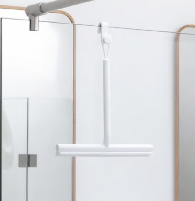 Multi-talent - un côté pour nettoyer les résidus de savon (brosse), un côté pour sécher (racloir).