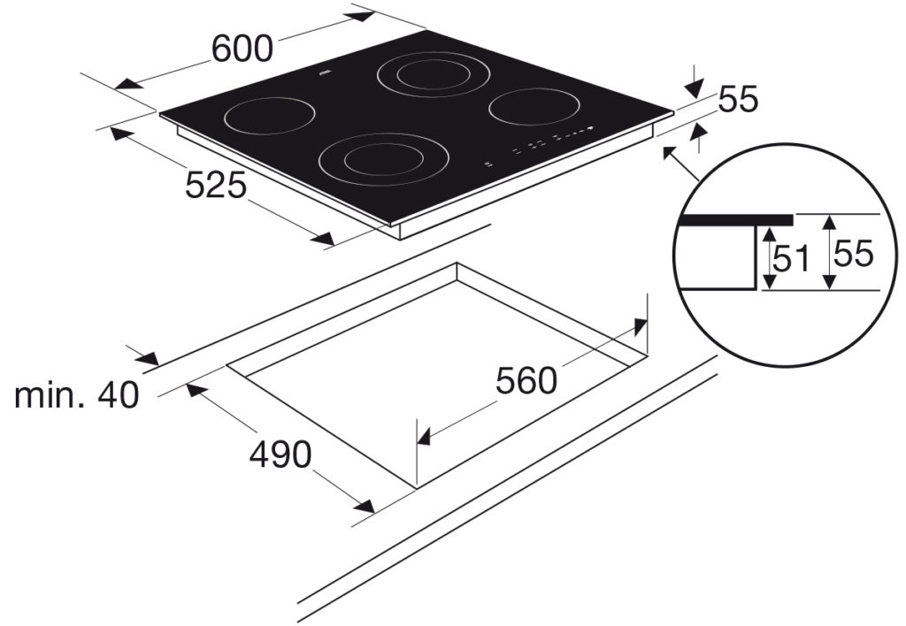 dimensions d’encastrement (hxlxp) 62 x 560 x 490 mm