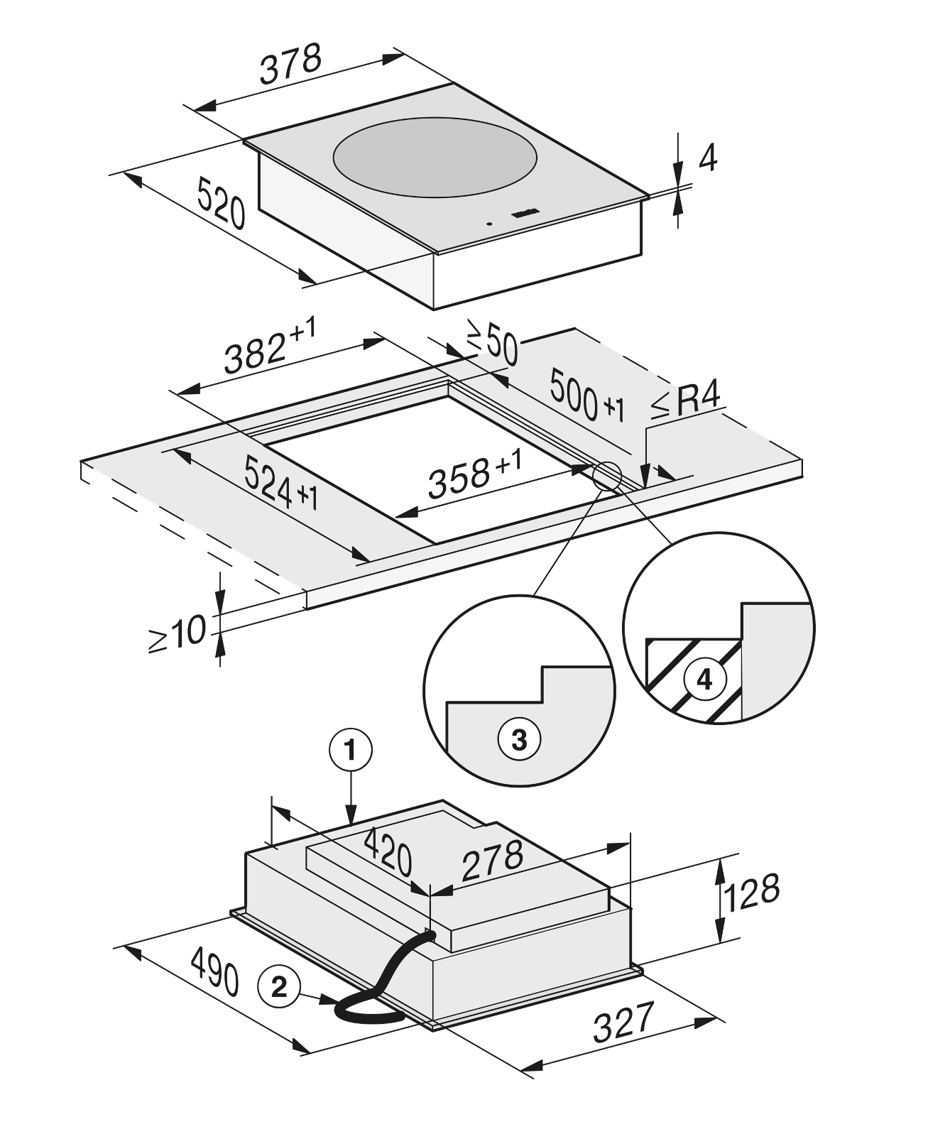 Dimensions de découpe en mm (profondeur) pour encastrement à plat: 500